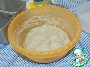 Добавляем в подошедшую опару 200 г ржаной муки и 75 г пшеничной муки высшего сорта. Может быть, надо добавить больше или наоборот убавить количество муки. Тесто должно быть липкое, упругое, но не забитое мукой. Смазываем руки и миску растительным маслом и вымешиваем 7 минут. Я рядом ставлю миску с теплой водой и как только тесто начинает сильно липнуть, окунаю руки в эту воду и продолжаю месить.
