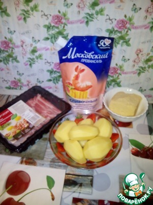 Бекон режем пополам, картофель пластинками, сыр натрем на крупной тёрке.