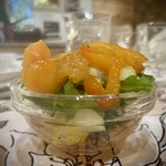 В порционные стаканы (вазочки, креманки) выложить немного салата, затем заправка на основе авокадо