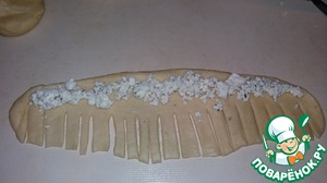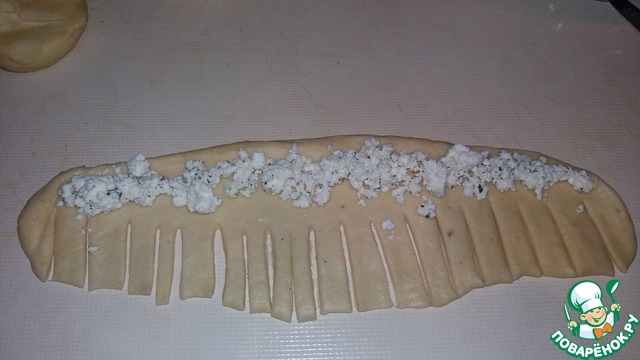 Тесто разделить на 25 кусочков. Из каждого вылепить жгутик ( муку не подсыпать!!!), затем раскатать его в длинный прямоугольник. С одной стооны выложить немного начинки, с другой сделать надрезы. Теперь сворачиваем рулетик, заворачиваем тесто с сырной стороны.
