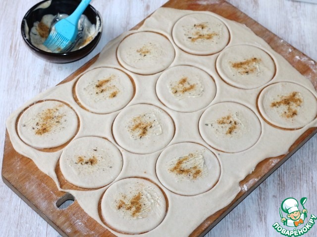 Раскатать размороженное слоеное тесто так, чтобы оно увеличилось в длину, в 2 раза.