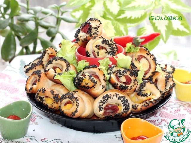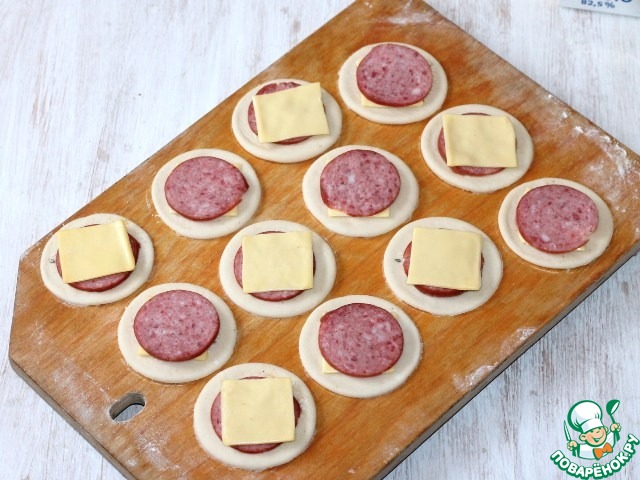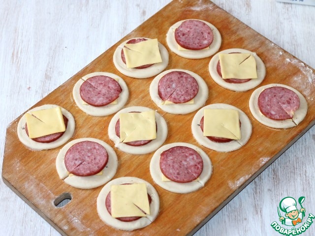 У меня кружок теста диаметром 7 см, кружок колбасы диаметром 5 см, разница в 2 см.