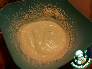 Взбить яйца с сахаром. Добавить масло (размягчённое), сметану. Перемешать. Добавить муку с разрыхлителем.