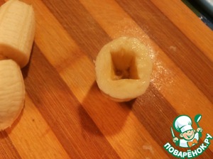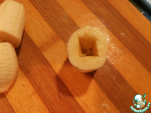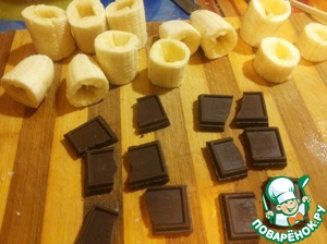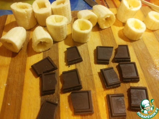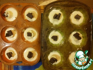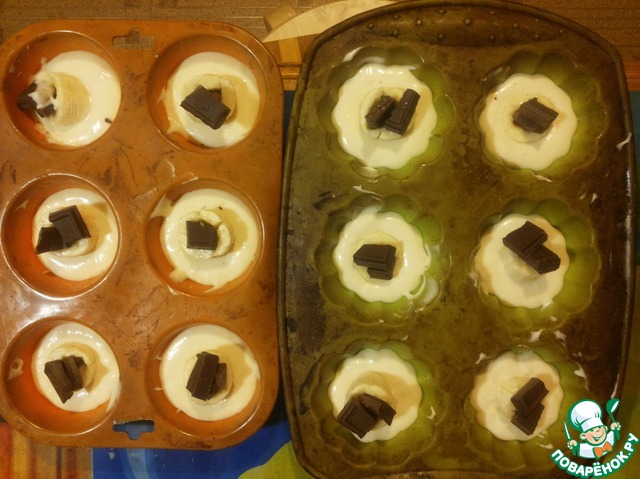 Наливаем тесто в формочки где-то наполовину, вставляем в середину банан и в его сердцевину кладём кусочки шоколада.