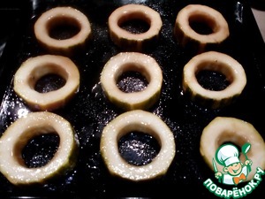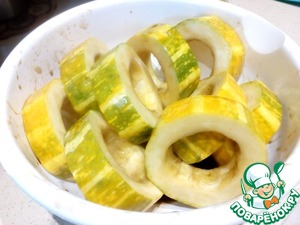 Кабачок нарезать кольцами ~2 см толщиной, убрать сердцевину, замариновать в рыбном соусе, у меня Чин Су премиум, и отставить мариноваться примерно на полчаса