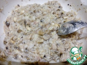 Фарш... Куриные грудки прокрутить на мясорубке с крупной решеткой, лук мелко нашинковать, не очень мелко порезать шампиньоны, выдавить чеснок, посолить поперчить и добавить майонез... всё смешать