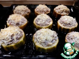 В кружочки плотно с горкой уложить готовый фарш, сверху посыпать тертым сыром. выпекать в духовке около часа при температуре 190 °
