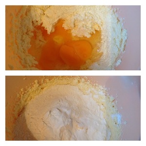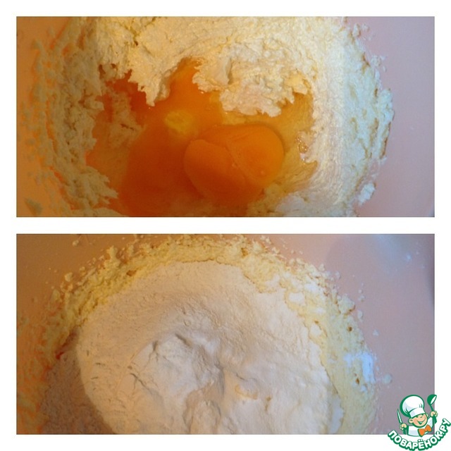Ввести яйца и продолжать взбивать минуты 2. Добавить разрыхлитель и муку, взбить. Тесто крутое и маслянистое, с ложки не стекает.