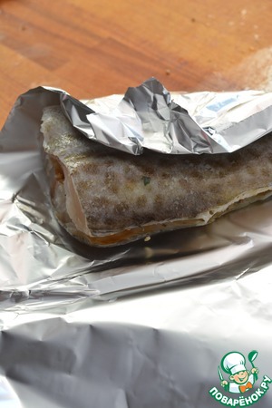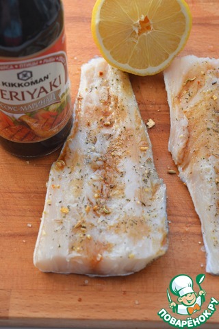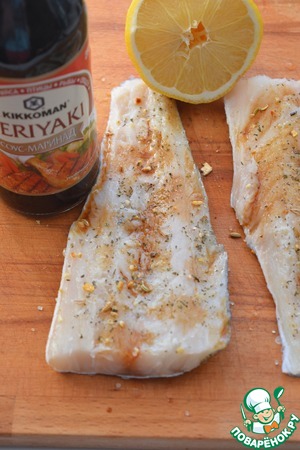 Филе трески без костей посыпьте специями для рыбы, приправьте соусом "Терияки" и сбрызните лимонным соком. Соедините две половинки филе кожей наружу, смажьте их маслом сверху