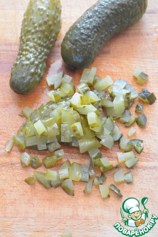 Маринованный огурец также мелко нарежьте и слегка отожмите от жидкости