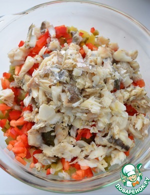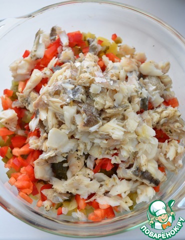 Остывшую рыбу вилкой разомните на небольшие кусочки, сложите все нарезанные ингредиенты в салатник