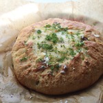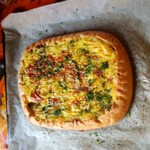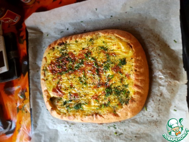 Испеченный пирог смазываем сливочным маслом (30 гр.) и посыпаем нарезанной зеленью.