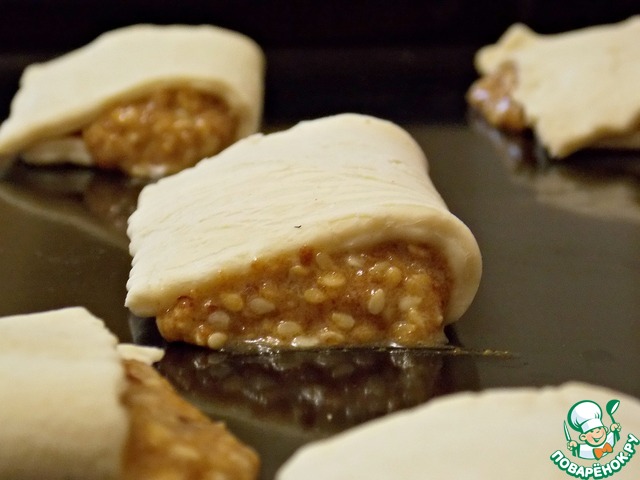 Эти слойки не совсем обычные из-за своей начинки. Они получаются с рассыпчатым верхом и необыкновенным ароматом кунжута.