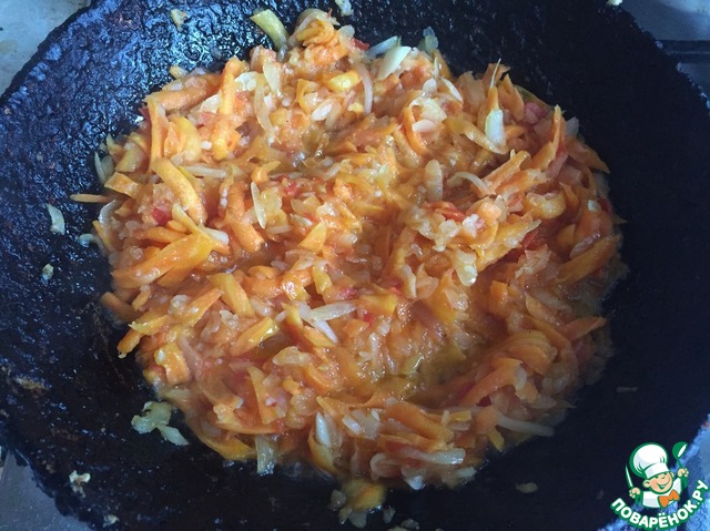 Лук, морковь, помидоры, чеснок мелко нашинковать и пассировать.