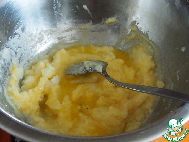 Картофель отварить и растолочь в пюре (я использовала готовое, оставшееся от вчерашнего обеда), добавить яйцо, соль.