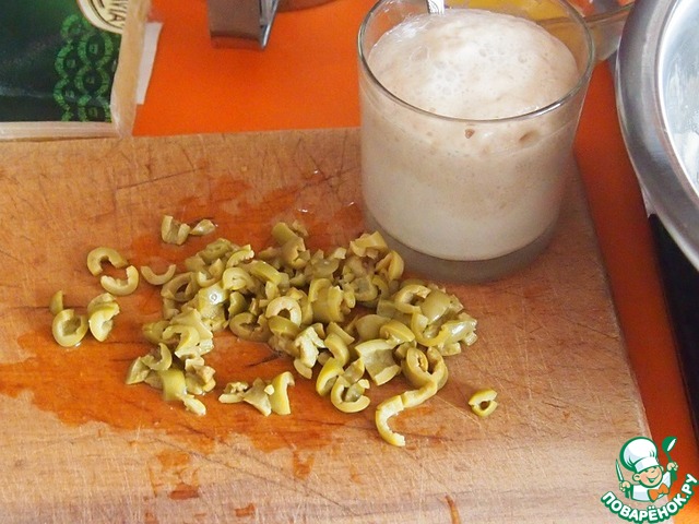 В теплой воде растворить дрожжи с ложечкой сахара и муки. Дождаться, пока образуется шапочка. Оливки нарезать небольшими кусочками. Масло растопить.