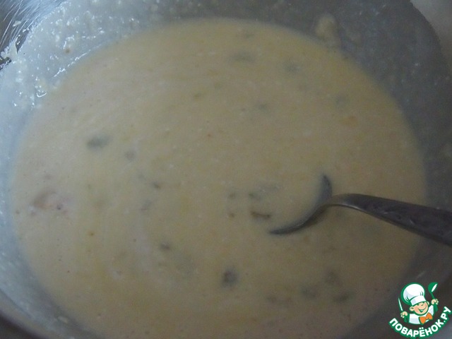 К картошке с яйцом добавить подошедшие дрожжи, сливки с кефиром (можно использовать только молоко), соль, две ложки растопленного масла, оливки. Размешать.