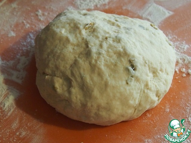 Добавить муку и замесить тесто. Муки может понадобиться чуть больше, но не нужно забивать тесто мукой, оно должно остаться чуть липковатым. Накрыть тесто полотенцем и поставить в теплое место на 30 минут.