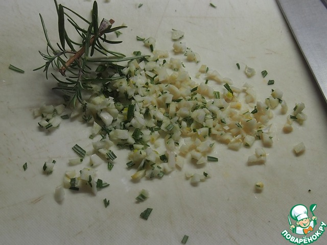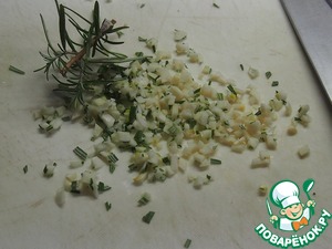 Тимьян и розмарин вместе с чесноком мелко порубить ножом.