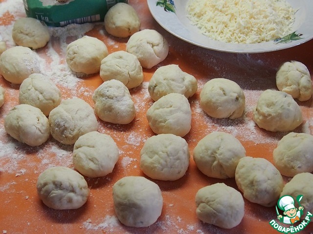 Из теста сделать шарики размером с крупный грецкий орех. Тесто будет немного липнуть к рукам, поэтому руки периодически опускаем в муку.