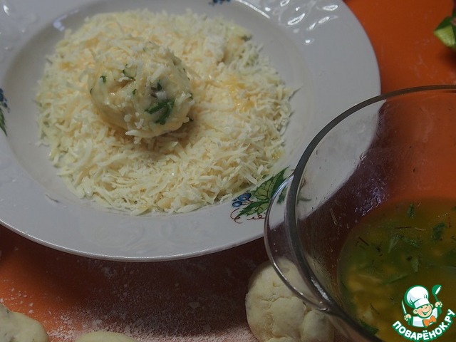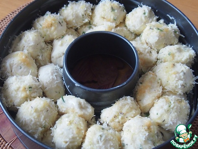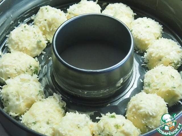 Форму для кекса смазать маслом. Каждый шарик с помощью чайной ложки окунуть в масляно-чесночную смесь, а потом обвалять в сыре.