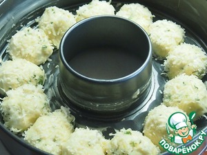 Шарики укладывать в форму по кругу почти впритык друг к другу.