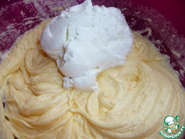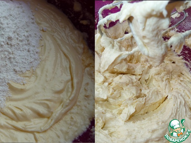 Частями ввести в яично-масляную-творо жную массу, взбить.