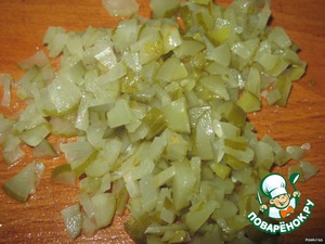 Огурец нарезать небольшими кубиками (или натереть на терке). -