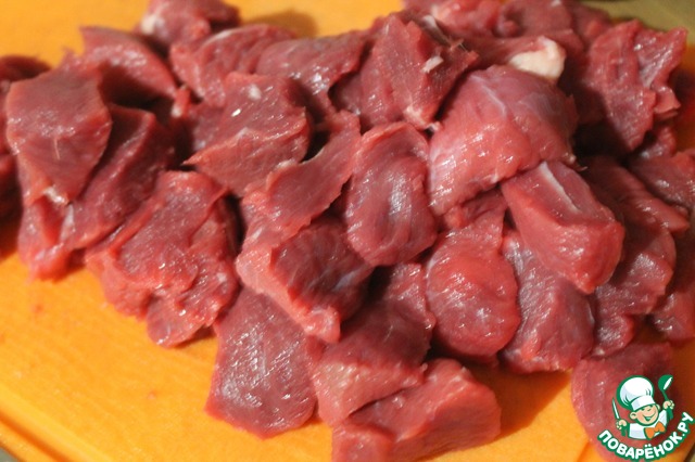 • В казане разогреваем растительное масло. Мясо нарубаем кусочками размером с грецкий орех.