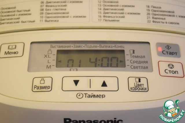 Выбираем режим "Основной хлеб" (если есть режим "Ржаной", то его), размер булочки L (в моей ХП это примерно на 500-550 г муки), цвет корочки - по желанию.