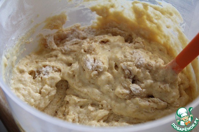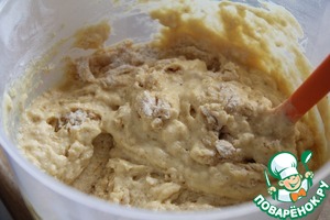 "Жидкая" часть - взбейте вместе яйца, масло, йогурт, и пюре тыквы. Залить жидкие ингредиенты в сухие и перемешать до однородности.