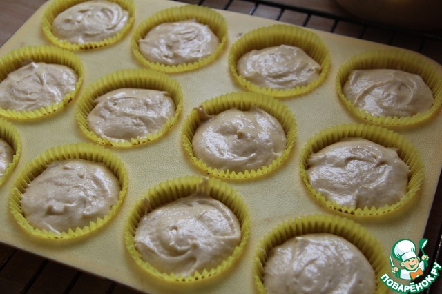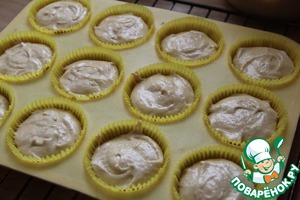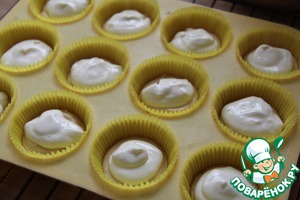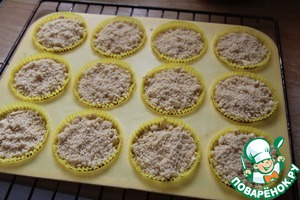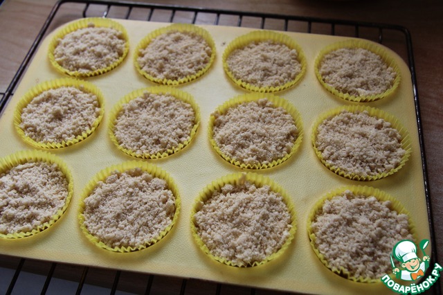 Выложить формочки для кексов в основу. И заполнить донышко основным тестом.