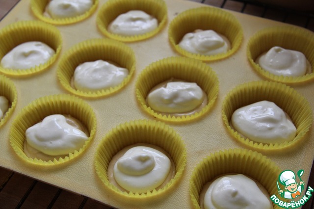 Накрыть начинку основным тестом Рассчитать нужно так, чтобы форма не была заполнена до верха (во время выпечки кексы поднимутся).