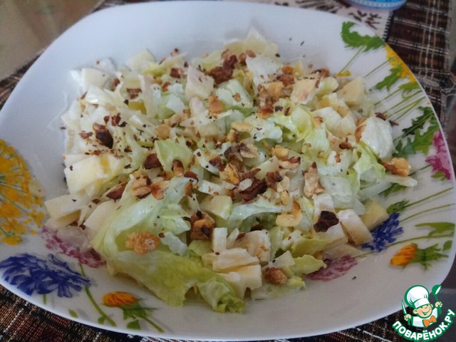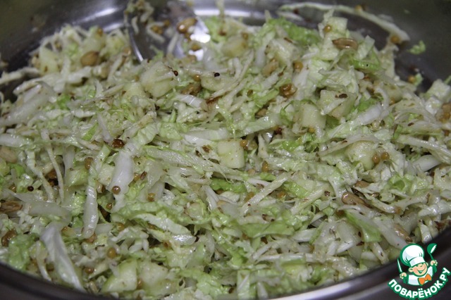 Все смешать, добавить горчицу, посолить. Добавить семечки и орехи. Заправить растительным маслом и перемешать.