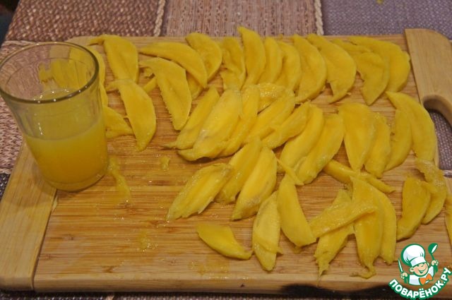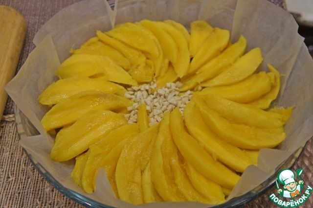 Видимо, мои манго были не слишком спелые, косточки никак не желали выниматься, пришлось отрезать дольки прямо с косточек, поэтому они не слишком ровные и красивые, но на вкусе и даже внешнем виде пирога это не отразилось. -