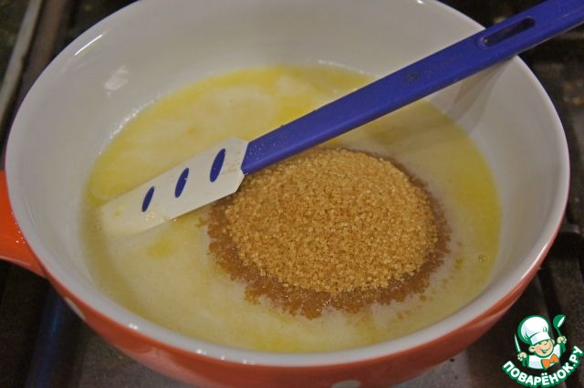60 г масла разогреть на сковороде, добавить коричневый сахар и, помешивая, варить 2 минуты до растворения сахара.