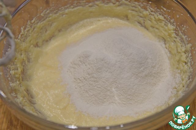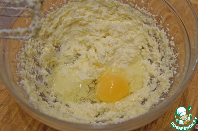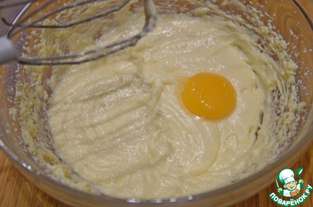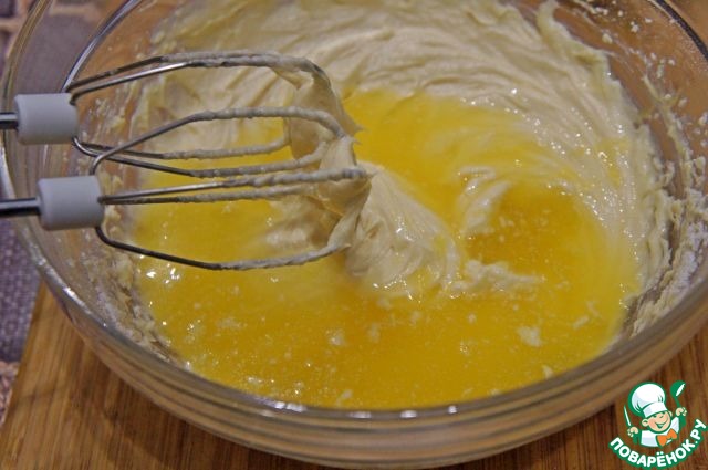 115 г масла комнатной температуры взбить с белым сахаром, добавить по одному яйца -