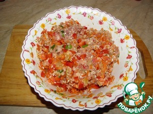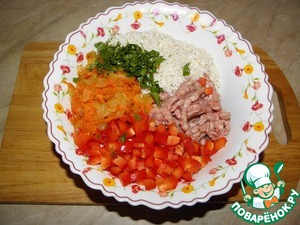 Воду с риса слить, соединить фарш, рис, нарезанный кубиком сладкий перец, мелко нарезанную петрушку, половина зажарки лука с морковью, чеснок (по желанию), посолить поперчить
