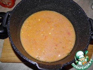Сделать подливку: помидор натереть на терке, добавить сметану, томат. пасту, я все это развожу с водой, добавить остальную часть зажарки лука с морковью, специи