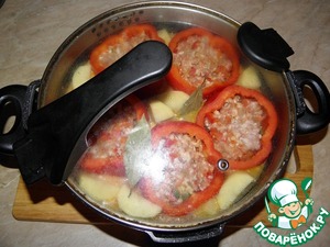 В промежутки между перцами вставить ломтики картофеля, долить по необходимости немного воды, не доходя до верха перцев, добавить лавровый лист, еще подсолить