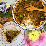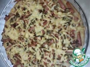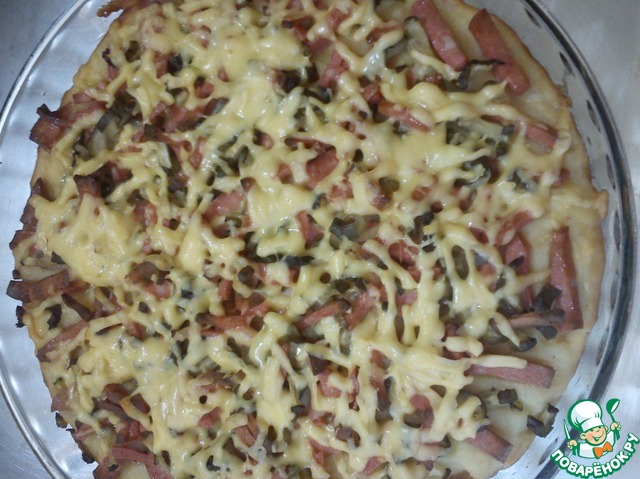 Этот пирог в рецепте идет с начинкой из тушеной капусты, я сделала начинку как на пиццу, так как пекла пирог на завтрак. Пирог очень сытный. Этот рецепт мне понравился потому что я не люблю тесто настаивающееся с дрожжами, а это тесто быстро замесил и уже готово.