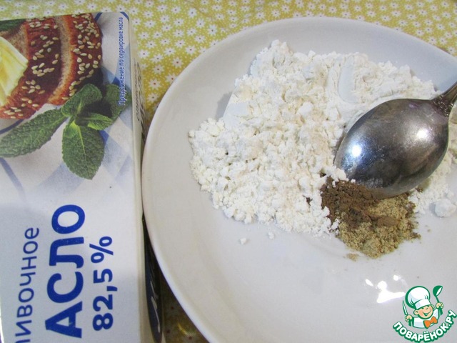 В чашке смешать специи: корицу, имбирь, соль. Добавить 2 ст. л. муки, хорошо перемешать.
