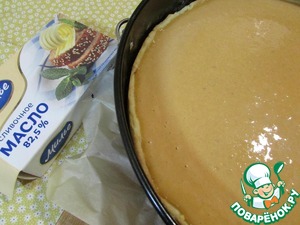 На тесто положить фольгу с грузом (у меня горох). Форму отправить в разогретую духовку (200 градусов). Выпекать 15-20 минут. Извлечь форму с коржом, снять груз и выпекать без груза еще 10 минут. Форму извлечь из духовки и дать коржу остыть. Духовку убавить до 180 градусов.