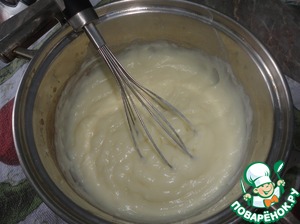 В яичную смесь влить тонкой струйкой подогретое молоко не прерывно помешивая венчиком, далее эту смесь перелить назад в кастрюльку и также не прерывно помешивая довести крем до кипения.