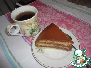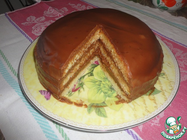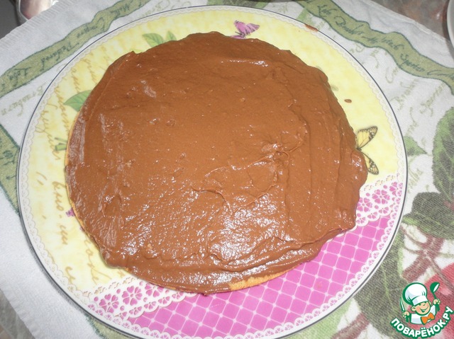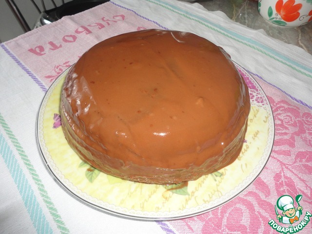 Третий корж поливаем глазурью и разравниваем по всей поверхности торта. Убираем готовый торт в прохладное место.