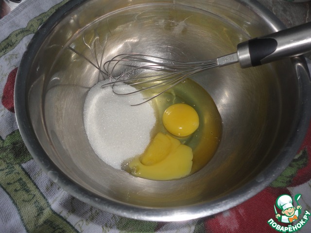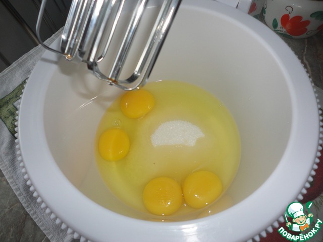 Начинаем замешивать тесто для бисквита. В миксере на большой скорости взбить яйца с сахарным песком до белой пены.
