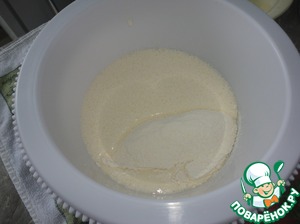 В яичную смесь добавить муку просяную с разрыхлителем. Далее вымешивать нужно лопаточкой.
