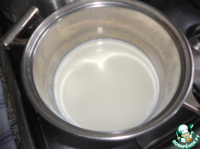 Пока выпекается бисквит сделаем заварной крем. В кастрюльке подогреем молоко но не вскипятим.