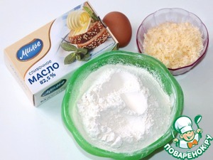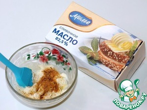 7. Для начинки пирога: смешиваем растопленное сливочное масло с любимой пряной приправой и сметаной. Натираем сыр на мелкой терке.
