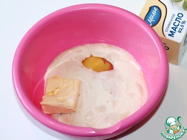 3. В большую миску выложить мягкое масло, добавить яйцо, соль, воду и опару, перемешать.